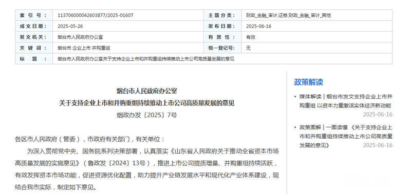 烟台市于2025年发布《关于支持企业上市和并购重组持续推动上市公司高质量发展的意见》